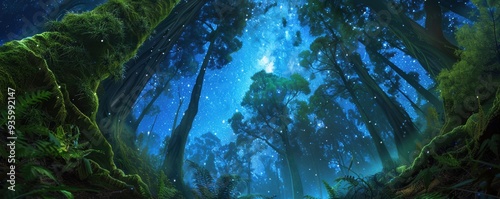 An ancient temperate rainforest from a low angle, looking up at a starry night sky and the Milky Way. Soft, diffused lighting is used to highlight the deep greens.