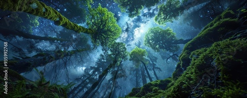 An ancient temperate rainforest from a low angle, looking up at a starry night sky and the Milky Way. Soft, diffused lighting is used to highlight the deep greens.