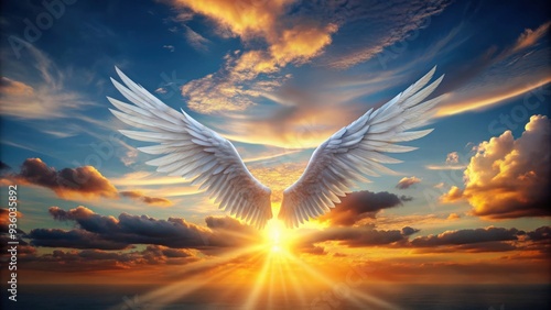 Abstract view of angel wings flying in the sky in front of majestic sunset, symbolizing religion and salvation concepts, angel