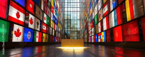 A vibrant display of Canadian provincial flags in a modern glass hallway, encapsulating national pride and cultural diversity in an urban setting.