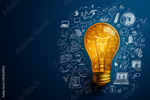 Light bulb shining with business innovation icons on blue background
