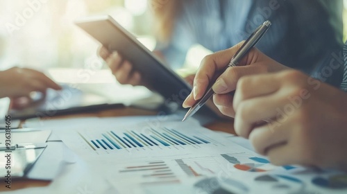 Businessman writes progress of work cost and uses tablet to analyze company financial budget report graph