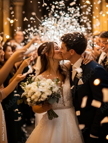 Joyful wedding celebration with the couple surrounded by guests throwing confetti in a romantic venue at night