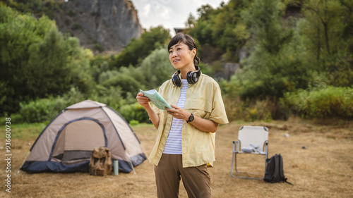 Front view of mature japanese woman stand and hold map look for road