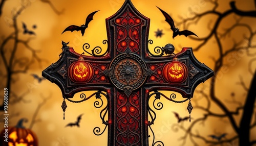 A spooky ornate cross with jack-o-lantern faces and bats in the background.