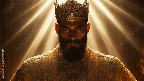 Mężczyzna z brodą w ozdobnych złotych szatach z finezyjnymi haftami i majestatyczną koroną.