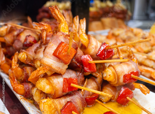 Typical snacks of Basque Country, pinchos or pinxtos skewers with small pieces of bread, fish, sea food, sweet green pepper served in bar in San-Sebastian or Bilbao, Spain