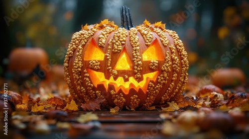 A glowing Jack-o'-lantern carved from a warty pumpkin sits among fallen autumn leaves, creating a unique and spooky Halloween scene.