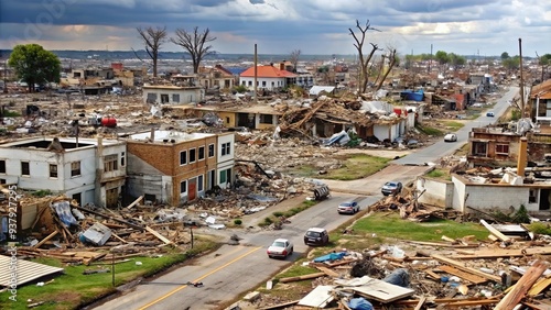 Devastating aftermath of a massive tornado, with destroyed buildings, debris-filled streets, and shattered remnants of a once-thriving neighborhood in Joplin, Missouri.