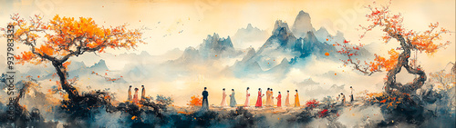 Romantic Watercolor Escapade: Couples in Love Amidst Serene Landscape