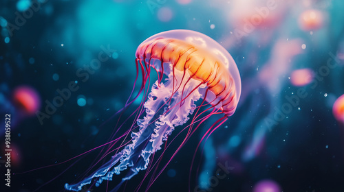 Kryształowe meduzy wibrujące w eterycznym podwodnym świecie, ukazujące ich hipnotyzujące piękno i delikatną elegancję w żywych, intensywnych kolorach