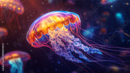 Kryształowe meduzy wibrujące w eterycznym podwodnym świecie, ukazujące ich hipnotyzujące piękno i delikatną elegancję w żywych, intensywnych kolorach