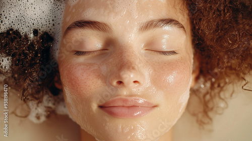 Bliskie ujęcie osoby z uśmiechem i zamkniętymi oczami, relaksującej się w pianowej kąpieli. Jej promienna cera i spokojny wyraz twarzy podkreślają elementy pielęgnacji skóry.