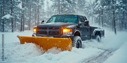 Pickup Truck Actively Plowing Snow on a Winter Road