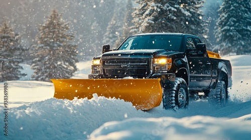 Pickup Truck Actively Plowing Snow on a Winter Road