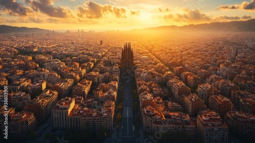 Aerial view of Barcelona City Skyline and Sagrada Familia Cathedral at sunset. Eixample residential famous urban grid. Cityscape with typical urban octagon blocks