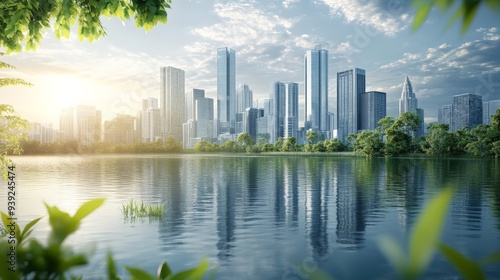 Stunning urban skyline with skyscrapers reflected in a tranquil lake, surrounded by lush greenery. Perfect cityscape stock photo.