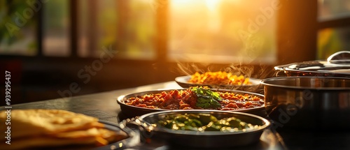 A traditional Indian thali with pure vegetarian dishes, vibrant spices arranged neatly, soft golden light, cultural significance, photorealistic, intricate details