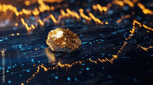 A shimmering gold nugget rests on a digital financial chart, symbolizing wealth, investment, and market dynamics.