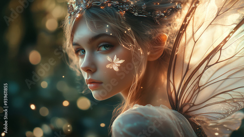 Zjawiskowy portret mistycznej wróżki z wyszukanymi detalami i błyszczącymi skrzydłami, na tle spokojnego lasu, wzbogacony czarującym efektem świetlnych bokeh.
