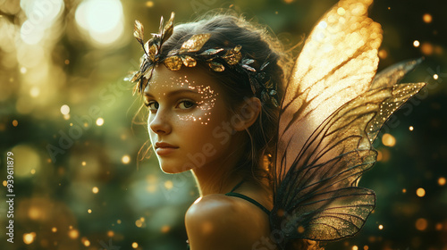 Zjawiskowy portret mistycznej wróżki z wyszukanymi detalami i błyszczącymi skrzydłami, na tle spokojnego lasu, wzbogacony czarującym efektem świetlnych bokeh.