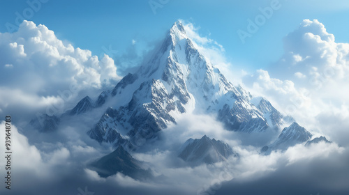 Imponujący, śnieżnobiały szczyt górski zanurzoną w chmurach, w spokojnym pejzażu, który oddaje ogromne piękno i ciszę natury.