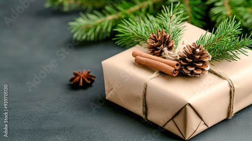 #1069234039A wrapped gift box, adorned with natural elements. Gift box is light beige kraft paper, tied with twine. Pine sprigs and pinecones decorate the top