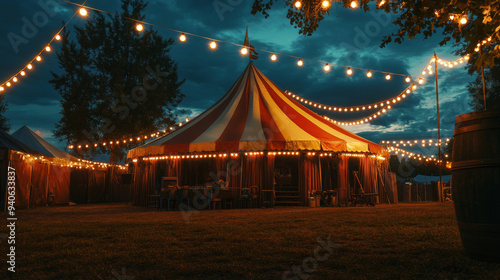 A small circus tent set against the backdrop of an evening sky, with a warm, inviting glow emanating from a row of lights strung around its perimeter. The tent, with its traditional red and white stri