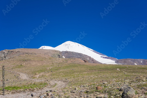 view of the double top of Mount Elbrus and the glacier flowing down from them into the valley