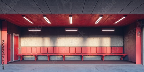 3D rendering of a red softball baseball dugout featuring a roof concrete flooring and red and gray team seating