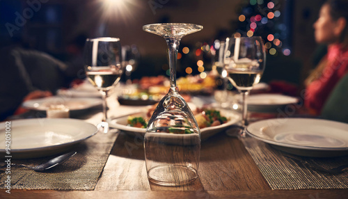 An empty wine glass turned upside down on a dinner table, with a celebratory meal in the background, symbolizing choosing sobriety during social events