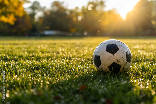 a soccer ball on freshly cut grass, with the dew glistening in the early morning light