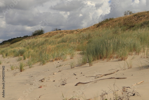 Coastal sand dune with grasses and native vegetation under a partly cloudy sky. A calm, natural scene showcasing a protected seaside habitat