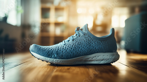 Modne, dzianinowe buty do biegania z wyraźnie zarysowaną, teksturowaną podeszwą, leżących na drewnianym blacie.