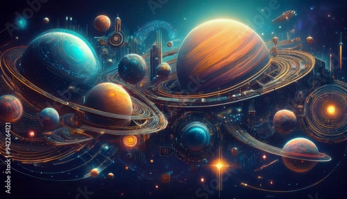 Futuristic planet system with exoplanets in space. Space-themed digital collage. Generated image