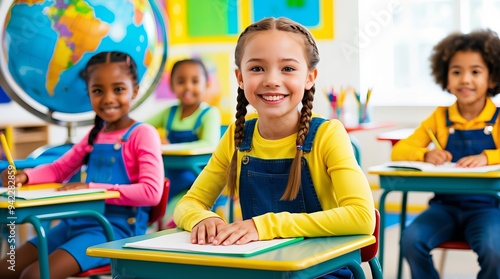 Scenę w klasie, gdzie cztery dzieci siedzą przy biurkach. Dziewczynka o jasnej skórze i długich brązowych włosach w warkoczach, uśmiechająca się w żółtej bluzie pod niebieskimi ogrodniczkami.
