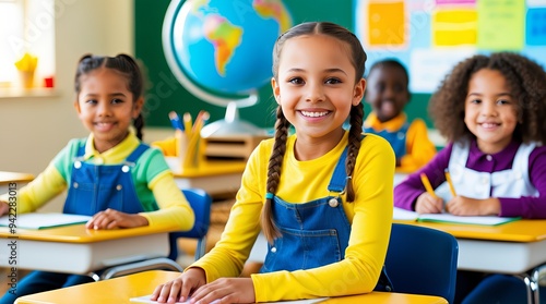 Scenę w klasie, gdzie cztery dzieci siedzą przy biurkach. Dziewczynka o jasnej skórze i długich brązowych włosach w warkoczach, uśmiechająca się w żółtej bluzie pod niebieskimi ogrodniczkami.