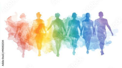 A group of people are walking in a rainbow line. The people are holding hands and are wearing colorful clothes. Concept of unity and togetherness