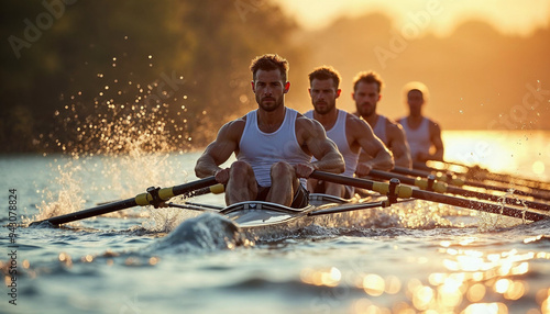 Professional rowing team in action with focused rower at back, dynamic water splashes, sunlight casting warm glow and shadows.