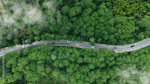 EV car, Electric car or hydrogen energy car on road midst forest and natural. Environmental friendly travel. Sustainable transportation and green logistic to Net zero carbon emission for Save earth.