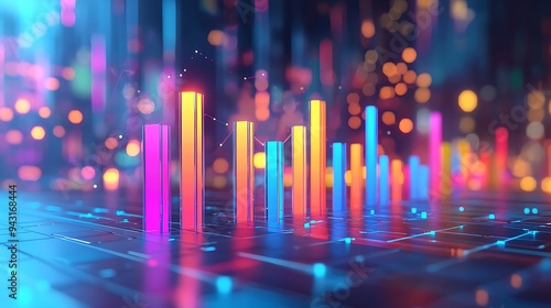 An abstract neon bar chart visualizes growth and data in a futuristic design, filled with dynamic energy.