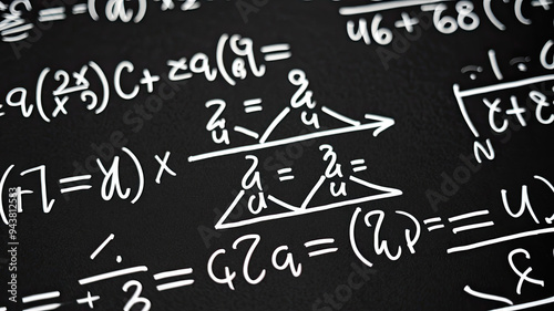 Math equations written in white chalk on a dark chalkboard background, showcasing various mathematical formulas and symbols in a classic educational setting