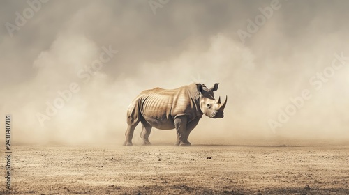 A solitary rhinoceros standing in a dusty plain, its massive form dominating the barren landscape around it.