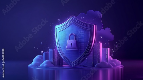 Futuristic cybersecurity concept with a shield and lock, protecting digital information against threats, in a virtual cityscape setting.