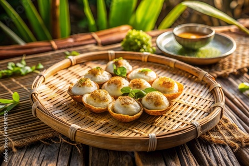 Khanom Krok on woven rattan tray earthy tones natural dappled light authentic rural Thailand atmosphere warm autumn morning mood