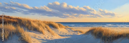 Autumn Cape Cod. Sunset Seascape Landscape with Golden Beach Grasses and Sand Dunes at Chatham Lighthouse Beach