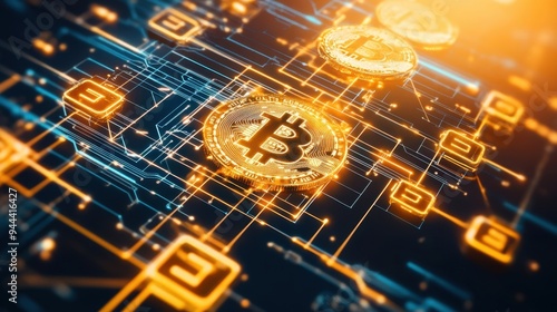 Futuristic Secure Digital Ledger with Blockchain Connections and Cryptocurrency Symbols