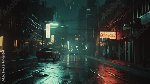 Cyberpunkowe miasto nocą, ukazująca puste, deszczowe ulice w dystopijnym krajobrazie. Obraz jest przepełniony neonowymi światłami, mgłą oraz ciemnymi kolorami.