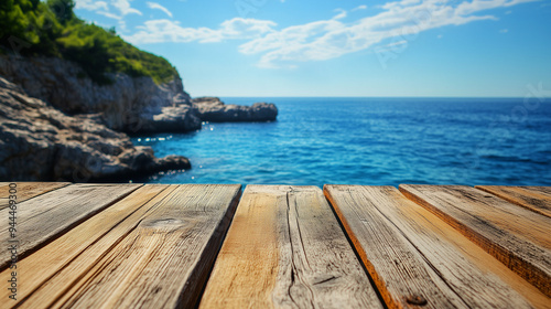 Drewniany stół umieszczony w przytulnym kąciku na tle morza i zielonej wyspy, pod błękitnym niebem.