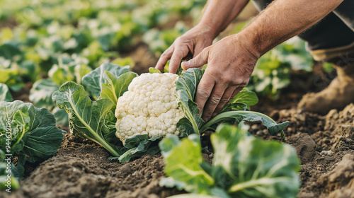 Farmer harvesting organic cauliflower in field